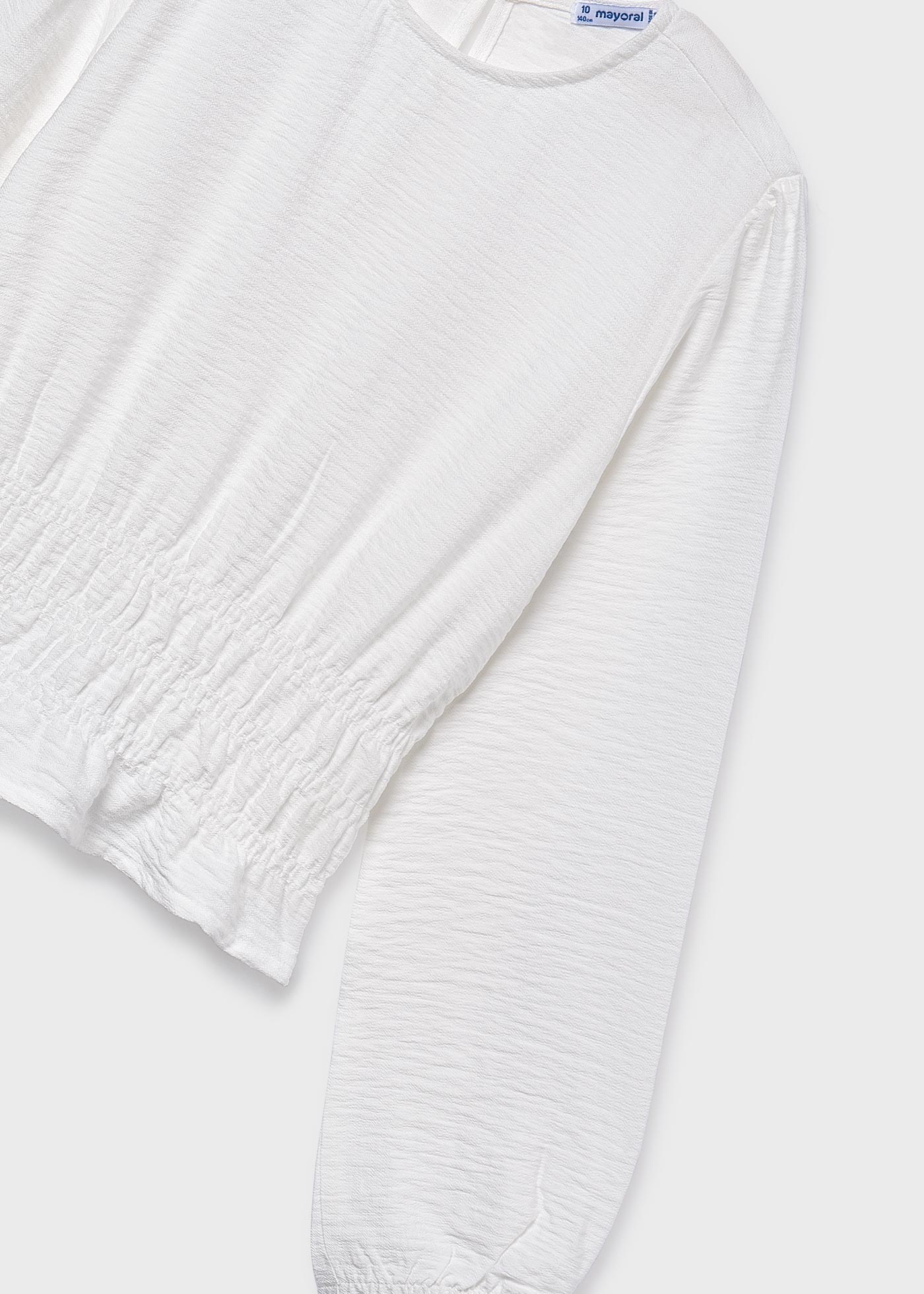 Blusa de manga larga para chica con puños elásticos en el interior. Cuello redondo. Pequeña abertura en la espalda con cierre de botón para facilitar la puesta de la prenda. Confección con tejido de crepé fluido y de caída suave. Elementos de adorno: detalles fruncidos de punto smock (nido de abeja). Diseño estampado.