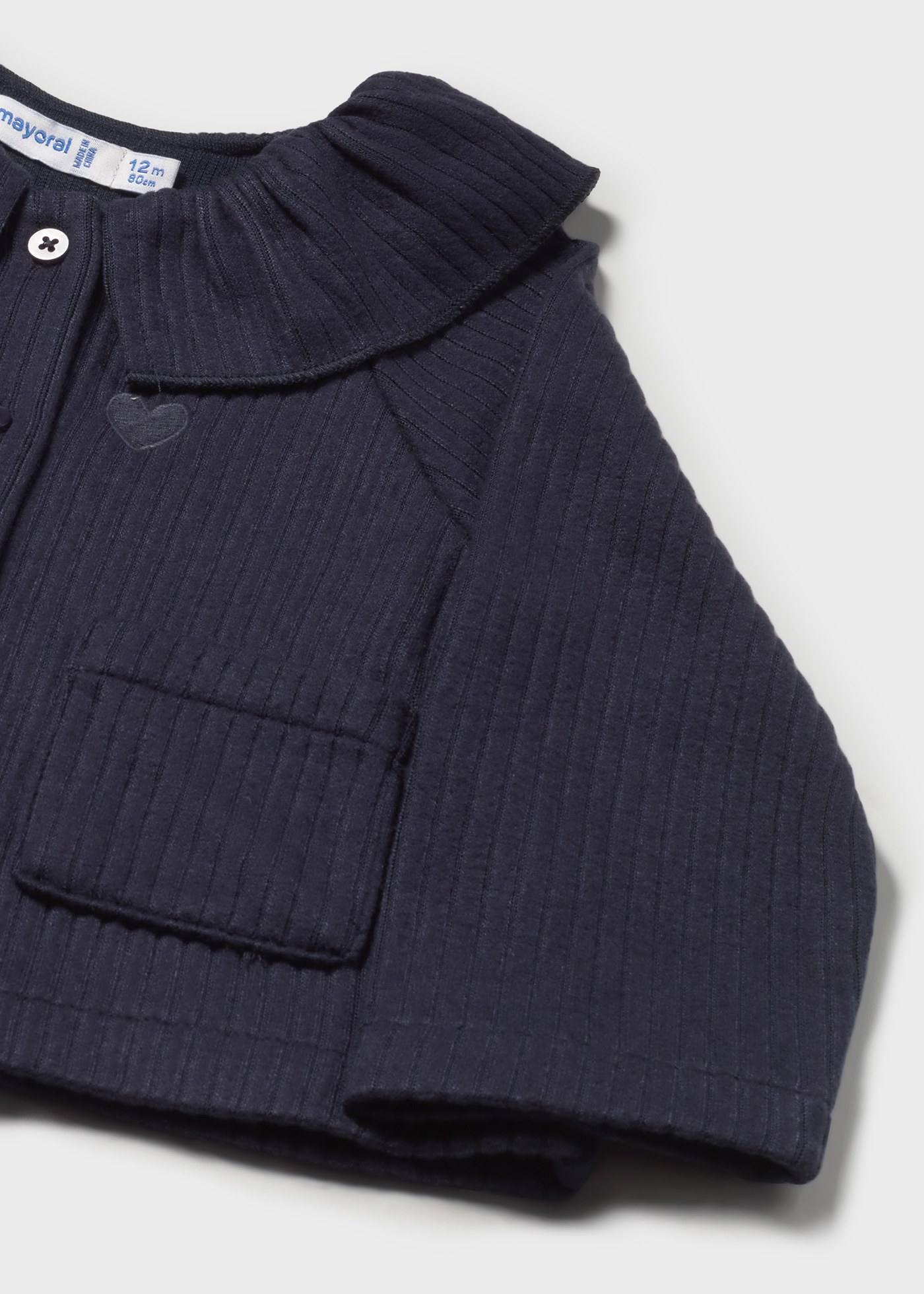 Chaqueta de manga larga para bebé. Cuello redondo con volante. Cierre con botones en la parte delantera. Confección combinada en distintos tejidos para conseguir un diseño único y especial. Bolsillos funcionales en la parte delantera. Elementos de adorno: bordado.