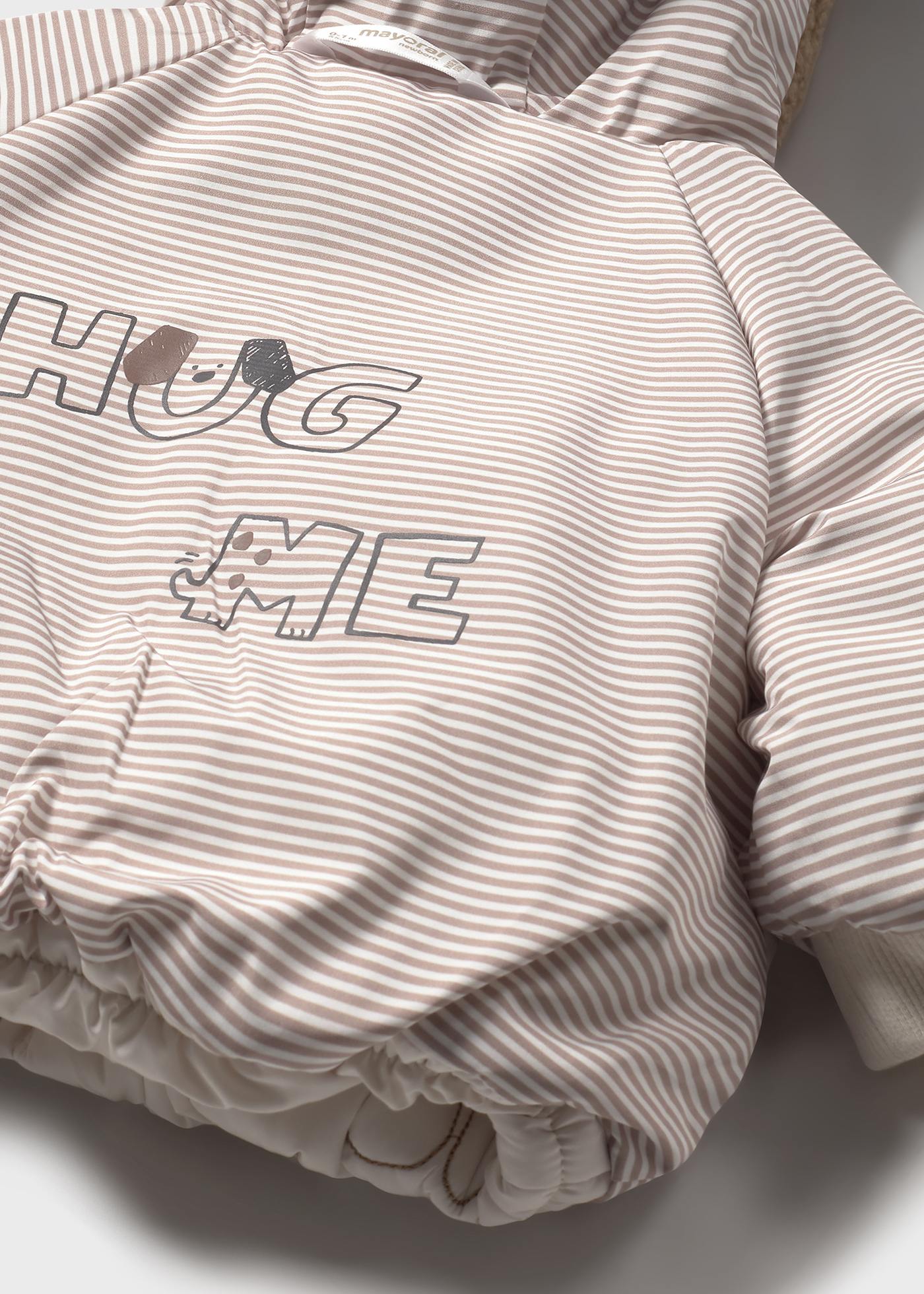 Chaquetón de manga larga para recién nacido. Capucha con detalles de pelo. Cierre central delantero con cremallera. Exterior textil con efecto acolchado. Suave forro interior de poliéster. Elementos de adorno: serigrafía (print). Este modelo presenta un diseño reversible.