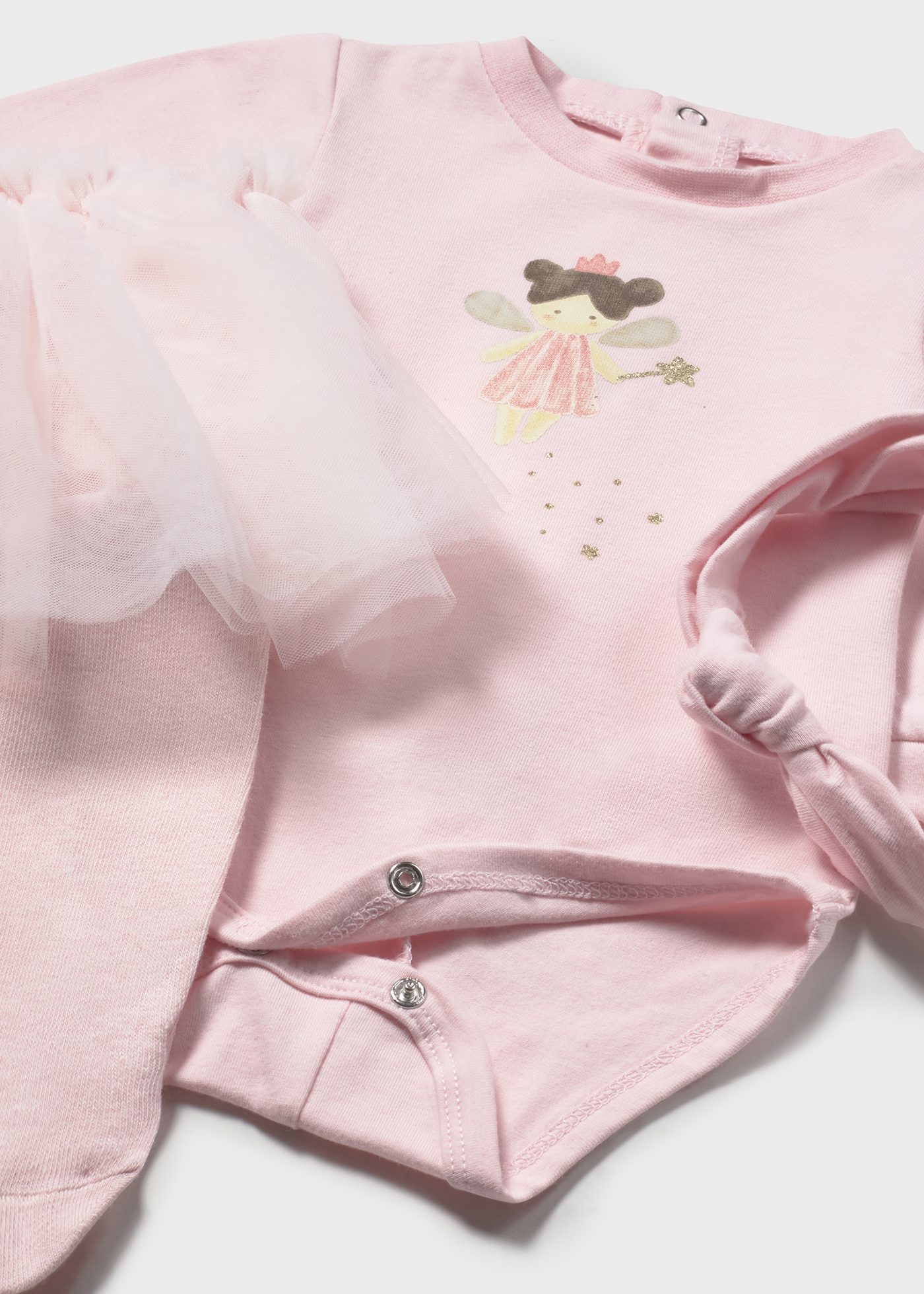 Body de manga larga para recién nacida con puños elásticos. Cuello redondo. Cierre con botones a presión en la parte posterior. Botones a presión en la entrepierna para facilitar la puesta de la prenda. Elementos de adorno: glitter, serigrafía (print).