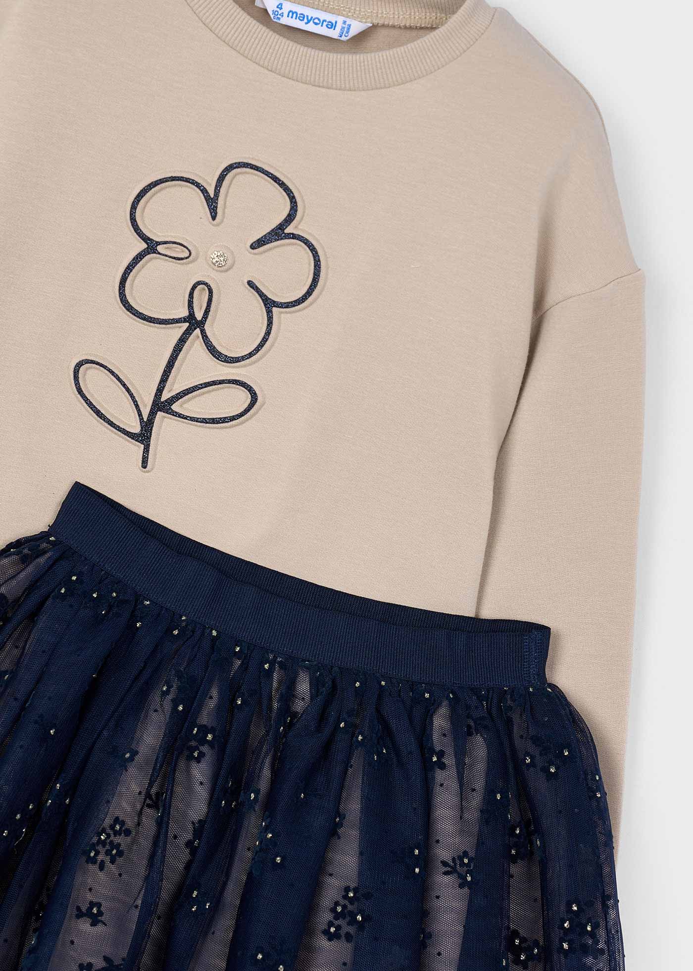 Sudadera de manga larga para niña. Cuello redondo. Bajo con diseño cruzado. Motivo decorativo en la parte delantera. Confección combinada en distintos tejidos para conseguir un diseño único y especial.