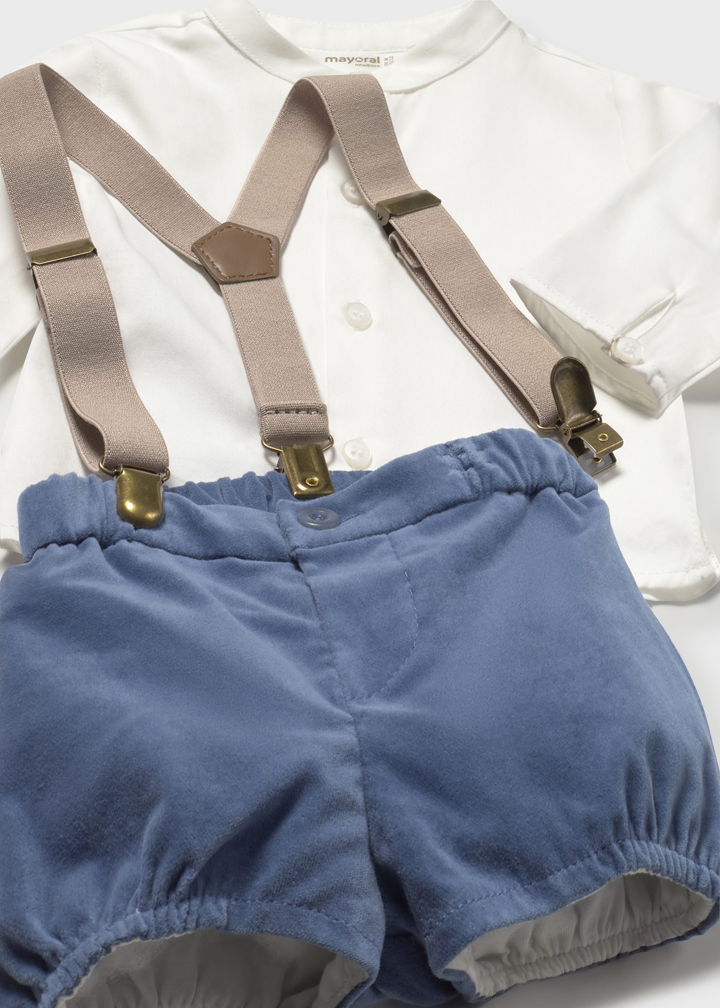 Conjunto de camisa y peto a juego para recién nacido.Camisa de manga larga para recién nacido. Modelo con cuello mao al tono. Cierre con botones en la parte delantera.Pantalón corto para recién nacido. Cierre con un único botón. Cinturilla elástica. Bajo elástico para un mejor ajuste.Tirantes elásticos ajustables para recién nacido que garantizan una perfecta sujeción.