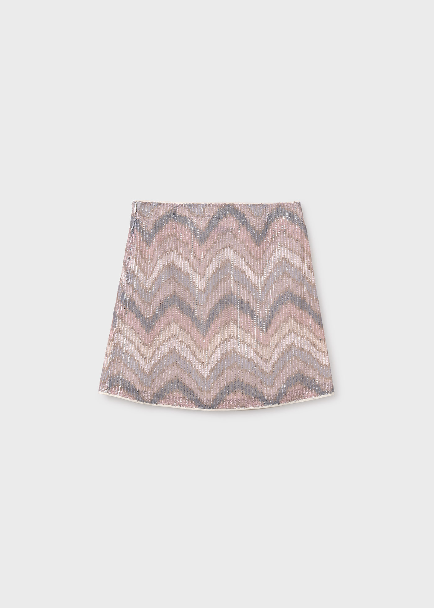 Falda para chica. Cierre con cremallera invisible en el lateral de la prenda. Goma elástica regulable con botones en el interior de la cinturilla para mayor ajuste. Suave forro interior de poliéster. Modelo con pinzas. Elementos de adorno: lentejuelas.