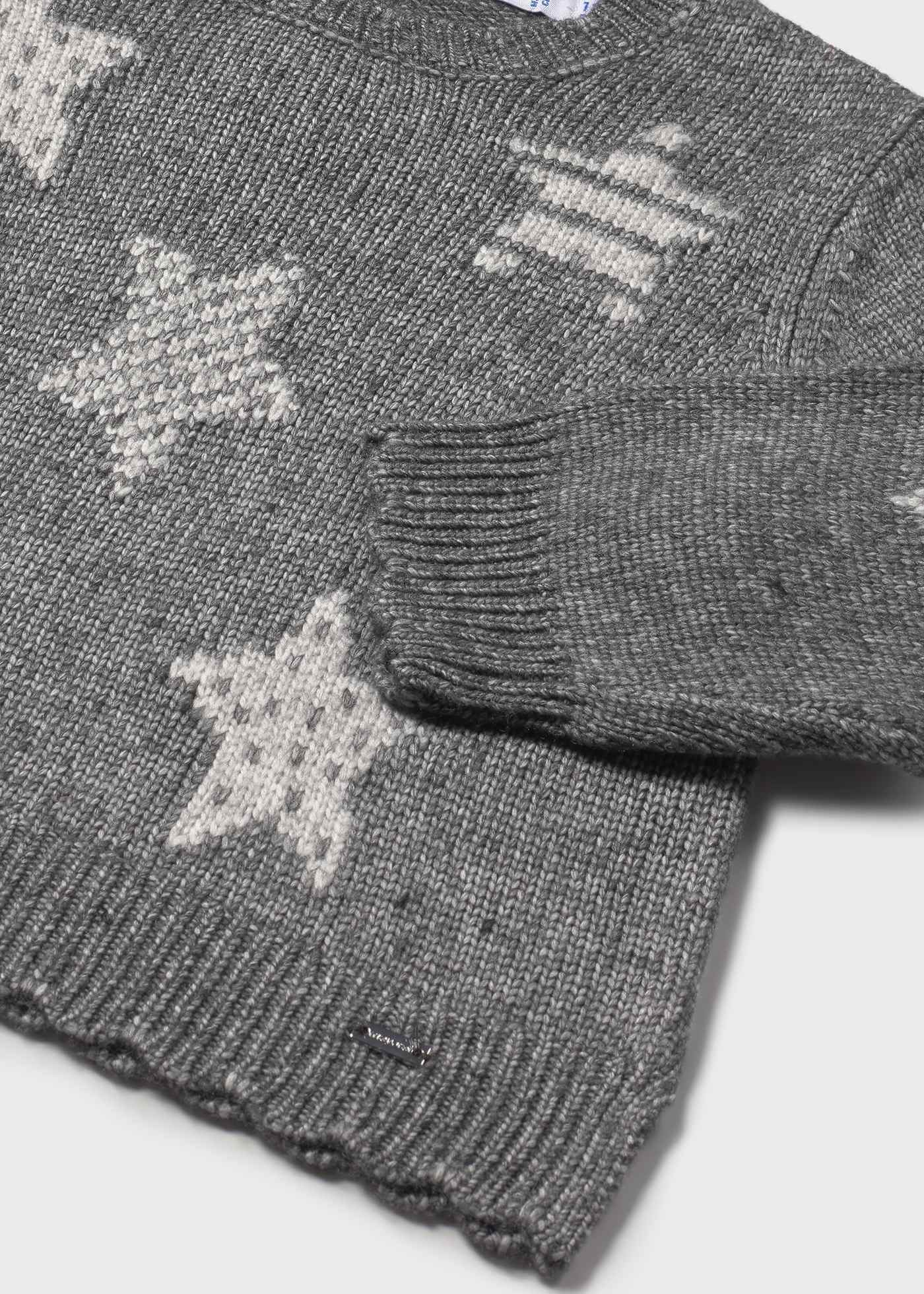 Jersey de manga larga para bebé. Cuello con ondas. Cierre con botones en la espalda para facilitar la puesta de la prenda. Confección combinada en distintos tejidos para conseguir un diseño único y especial. Elementos de adorno: dibujos decorativos.
