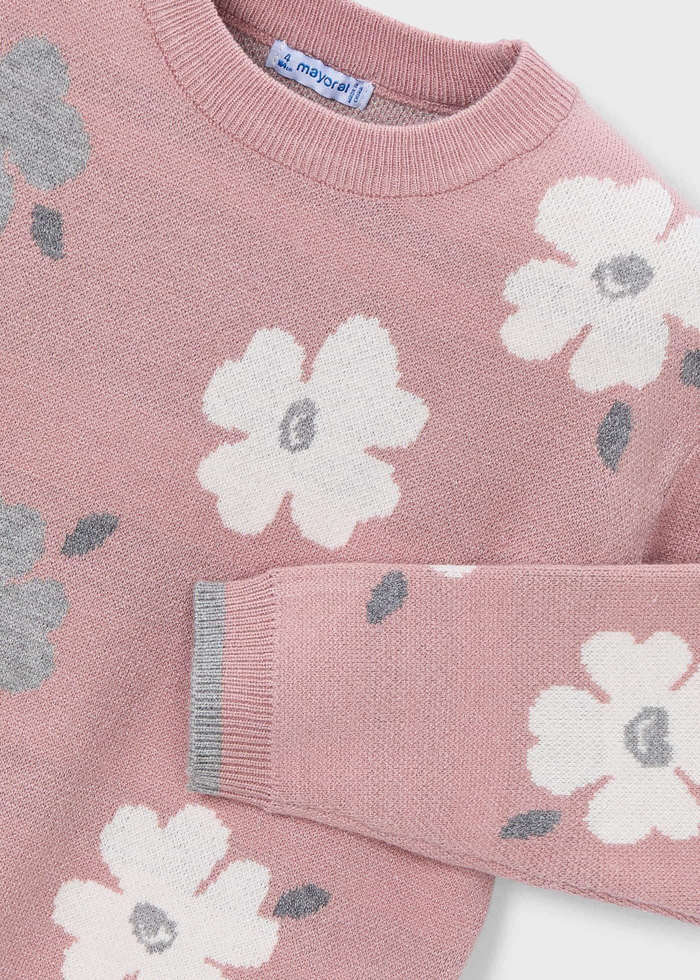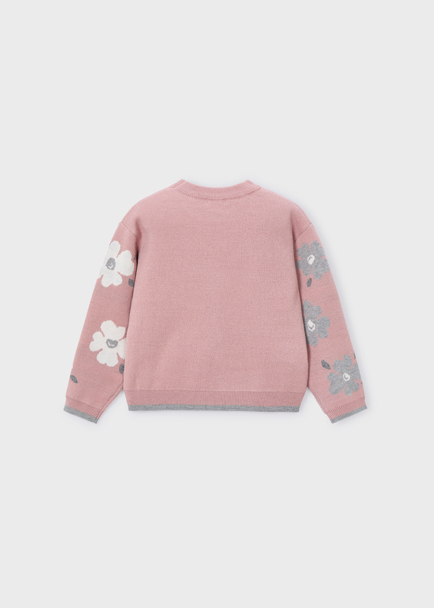 Contiene poliéster reciclado. Jersey de manga larga para niña. Cuello redondo. Dibujos en punto jacquard.