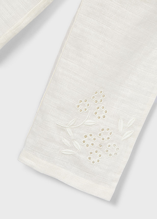 Pantalon largo lino bordado Temperatura máxima de lavado 3 Prohibición de lejía Secar en vertical Planchado a temperatura máxima
