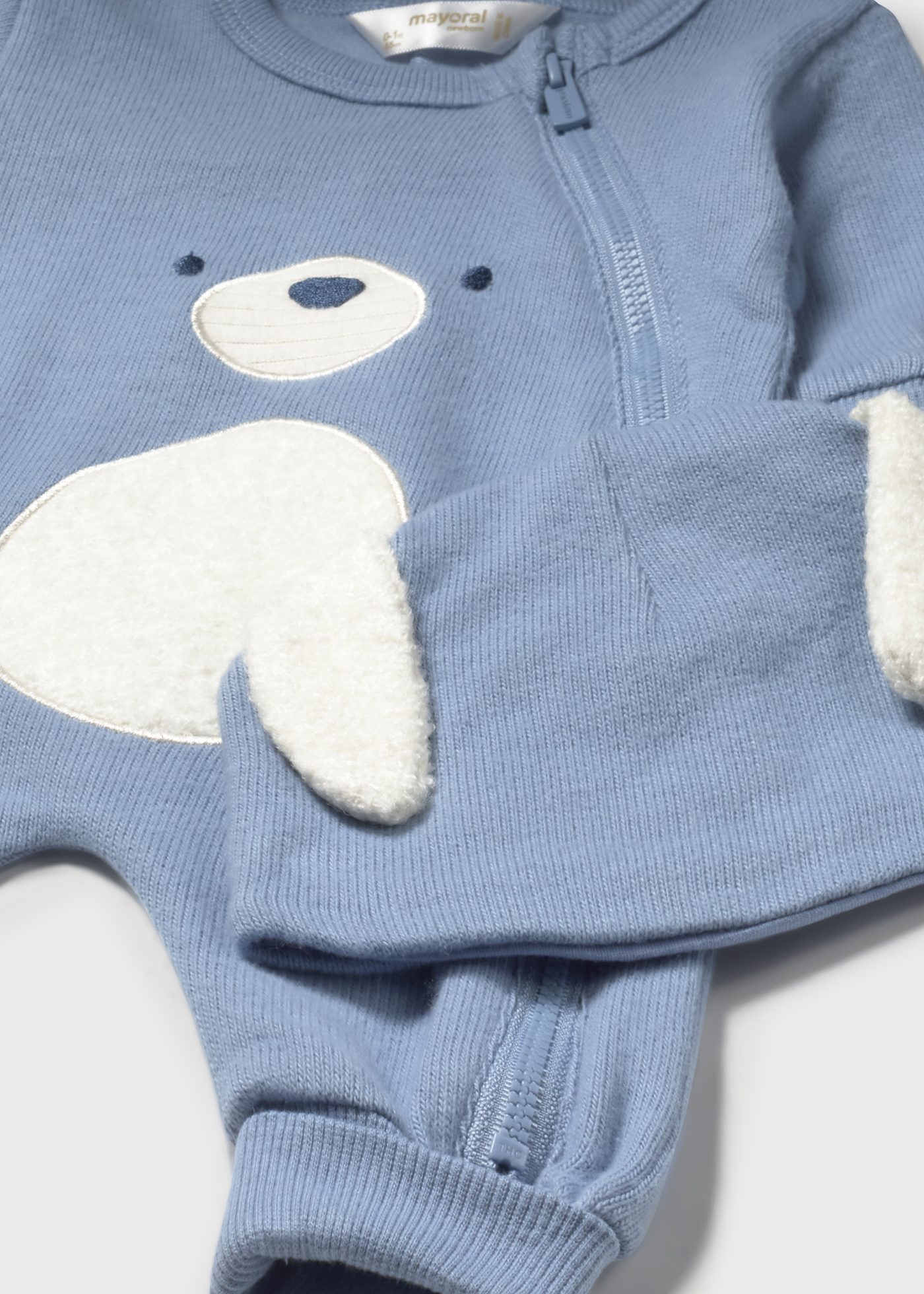 Pelele de manga larga para recién nacido. Cuello redondo. Cierre con cremallera. Tejido de punto tricotosa de tacto suave y agradable. Elementos de adorno: bordado.