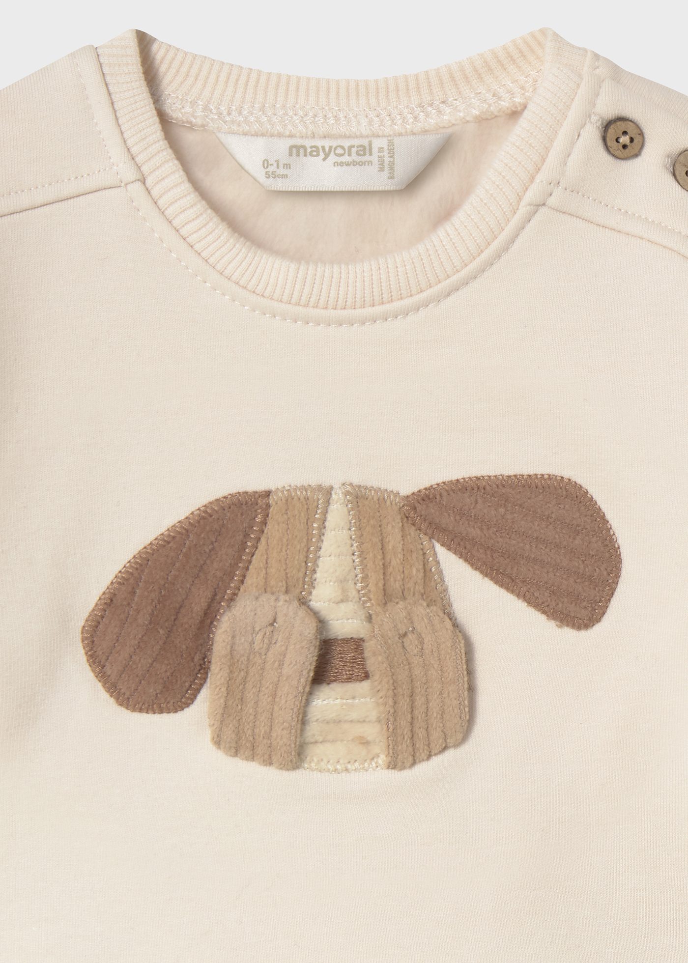 Sudadera de manga larga para recién nacido. Cuello redondo. Botones en el hombro para facilitar la puesta. Elementos de adorno: apliques decorativos, bordados.