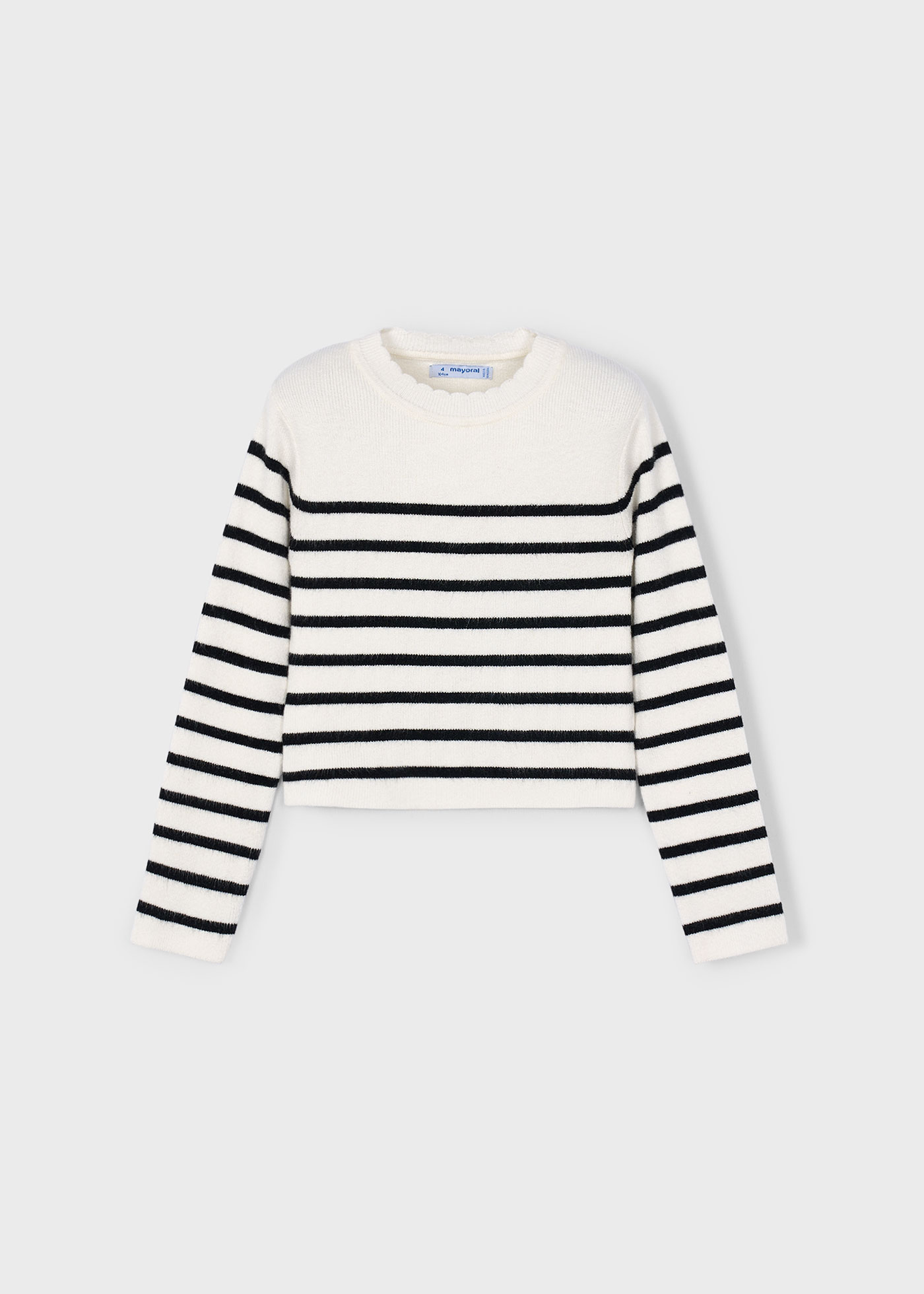 Top de manga larga para niña. Cuello con ondas. Tejido de punto tricotosa de tacto suave y agradable. Motivo de rayas.