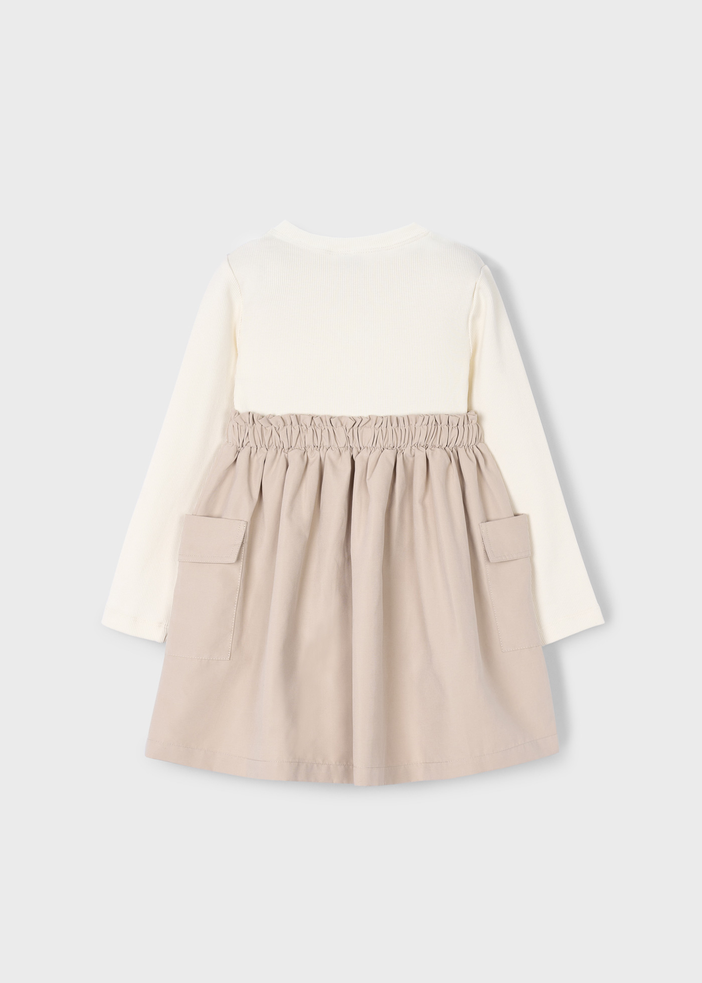 Vestido de manga larga para niña. Cuello redondo. Diseño con camiseta en superposición. Cinturilla elástica. Confección combinada con cuerpo y falda en distintos tejidos para conseguir un diseño único y especial. Modelo con rizo. Bolsillos en los laterales.