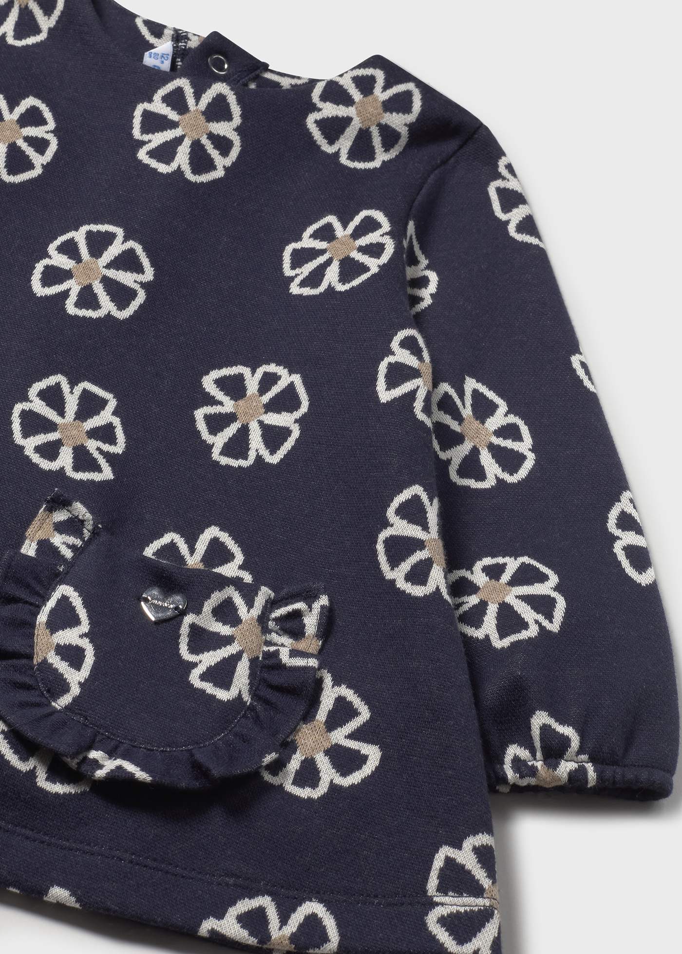 Vestido de manga larga para bebé con puños elásticos. Cuello redondo. Cierre con botones a presión en la parte posterior. Cálido tejido elegante y sofisticado para las ocasiones más especiales. Modelo con volantes. Bolsillo funcional en la parte delantera. Diseño estampado.