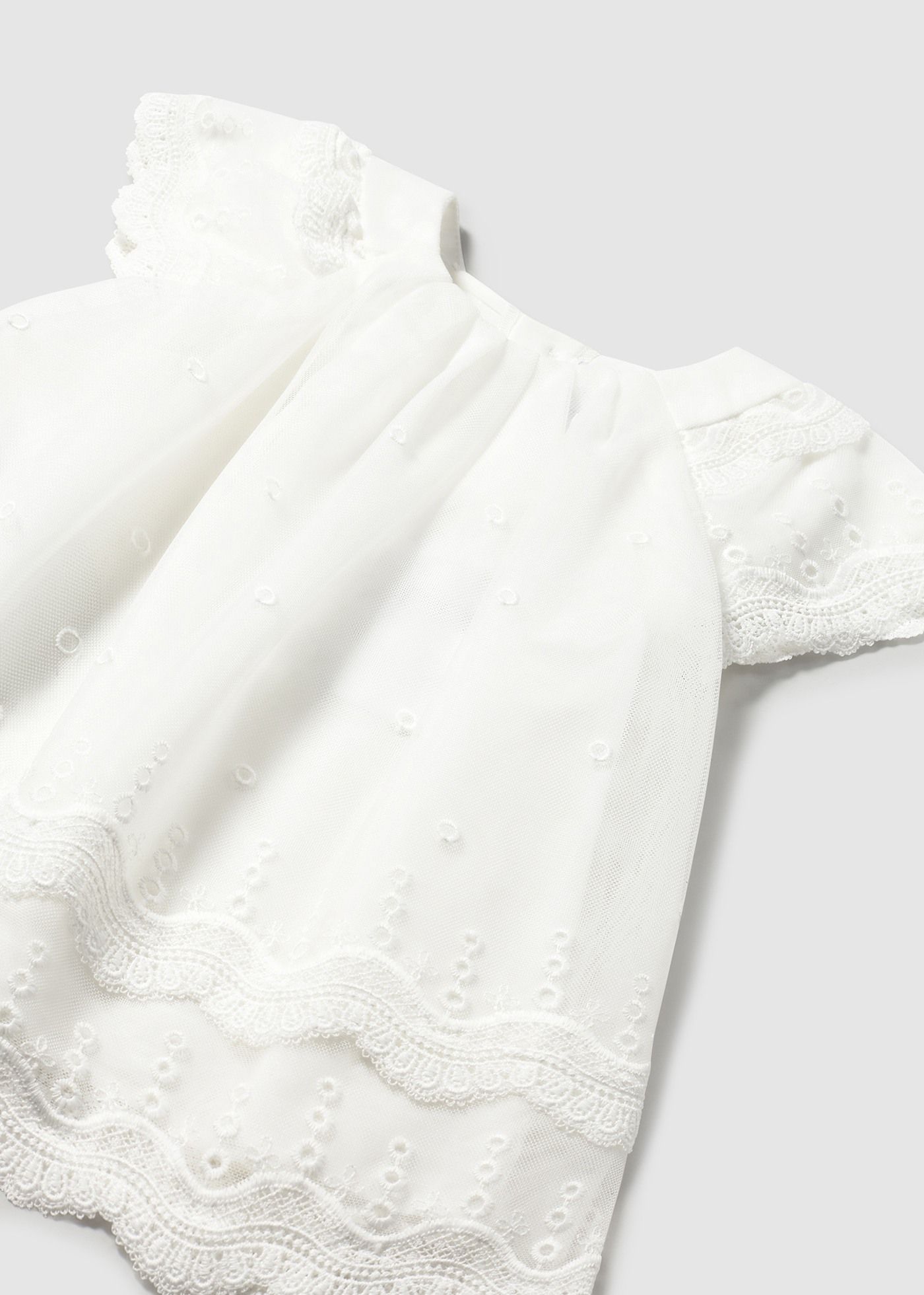 Vestido tul bordado 100% Poliéster 100% Algodón Temperatura máxima de lavado 3 Prohibición de lejía Secar en vertical Planchado a temperatura máxima No lavar en seco